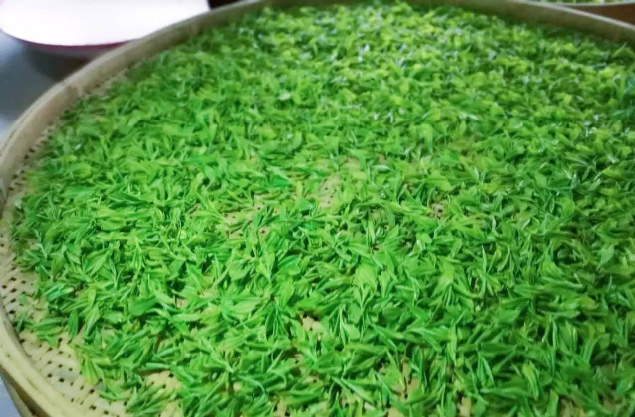 采摘后的茶芽,在竹匾里摊青:厚度、时间,都有严格要求,并根据多年经验实时调整,非一般散户茶农可以达到。