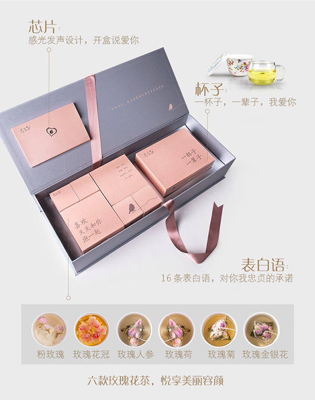 茶人岭的“520tea你表白礼盒”——精选6款玫瑰主题花草茶;一套杯具;印在包装上的16句情话,让对方感受你款款心意。此外,礼盒内置感光发声芯片,只要打开盒子,就可听到最深情的告白,“宝贝,我爱你”。